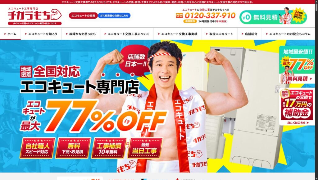 チカラもちは信頼できる業者であり、急遽お湯が使えなくて困っているような緊急時にもスピード対応してくれます。エコキュートが動かずお困りの方は、まず見積無料のチカラもちにご相談ください。